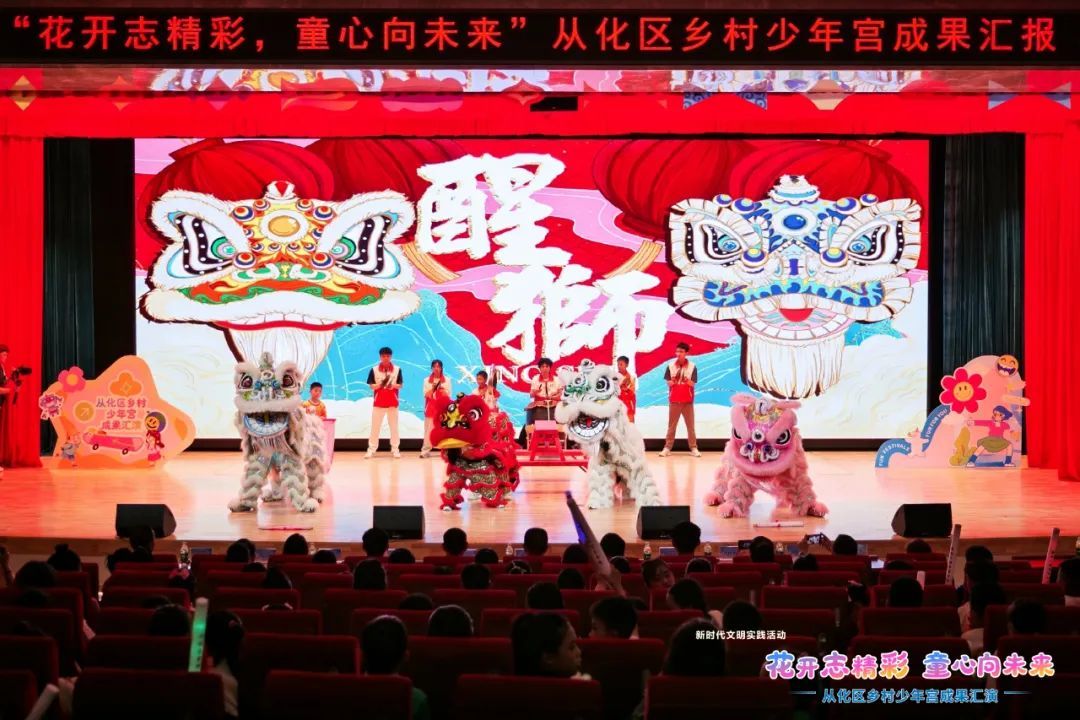 在随后文艺汇演环节中,乡村少年宫学员们带来的精彩节目轮番上演。醒狮节目《狮舞跃动》以震撼的醒狮表演展现岭南文化魅力,引得现场观众阵阵喝彩;